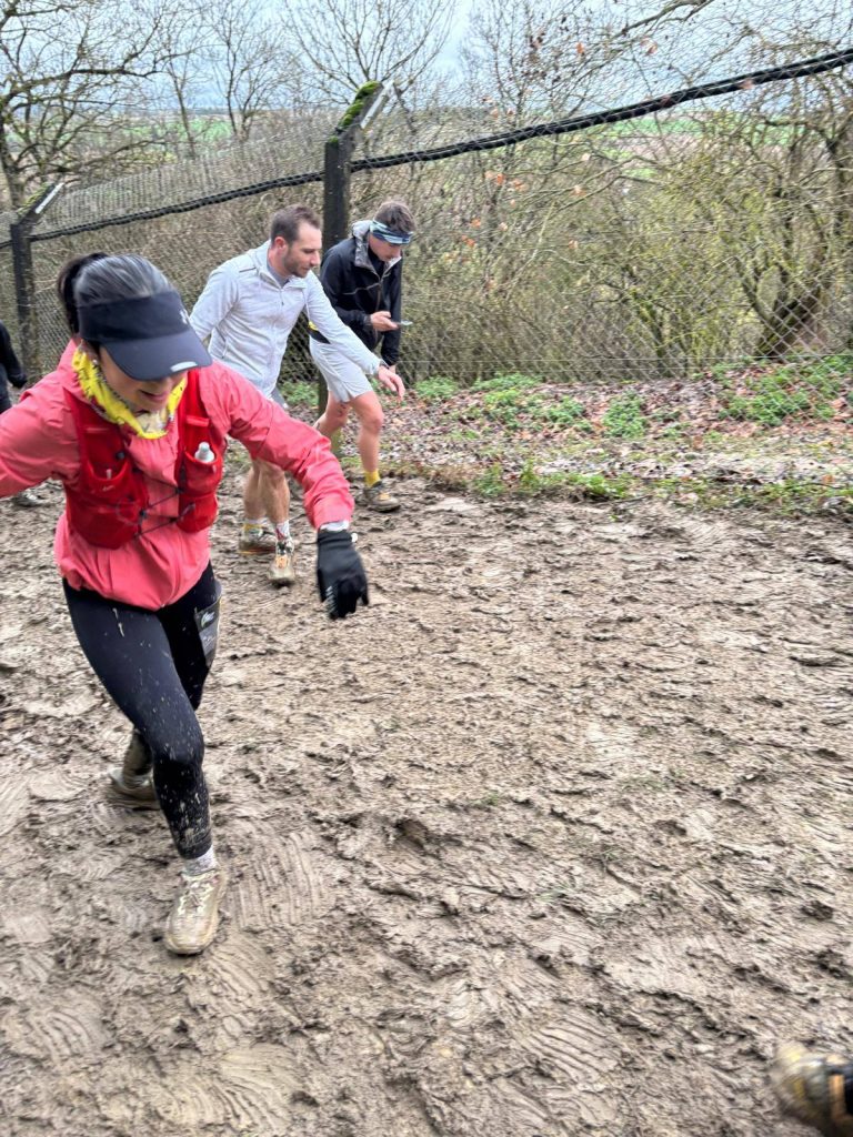 Lors du Trail des Coteaux de Bellevue, une immersion dans la boue a été expérimentée par Nadège, Élodie, Laurent et Sylvain. Le célèbre « t’inquiète, c’est sec » s’est finalement révélé être, comme souvent, un doux mensonge. 😂